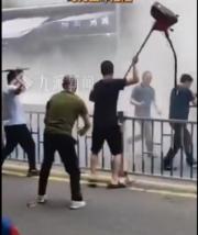 網傳短片顯示,事發現場冒出火光和濃煙,途人四散逃離,幾名男子手持長棍等物,追打疑似肇事男子,後者手持黑色背包,未知內有何物。(綜合報道)