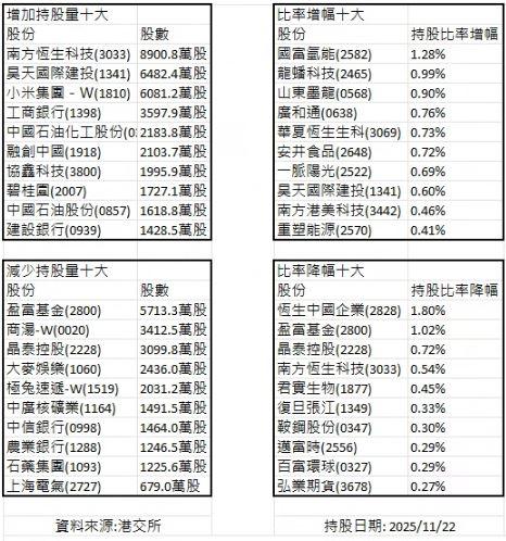 整理港交所披露易「滬港通及深港通持股紀錄」後的資料顯示,上日(持股日期: 2025/11/22)持股量增加最多的是南方恆生科技(3033),增加8900.8萬股,而減持最多的是盈富基金(2800),減持5713.3萬股。