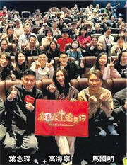 3套港產片演員連日來四出謝票谷票房,馬國明伙高海寧和導演葉念琛日前蛇年首現身戲院為《麻雀女王追男仔》謝票,3人連跑幾場,又在戲院大堂逐一跟粉絲合照,隨即出現人龍,現場水泄不通。高海寧當日早上從美國工作回港,甫落機即加入謝票,「觀眾好熱情,頭先一入戲院佢哋就以歡呼聲歡迎我哋,覺得可以多啲謝票,同觀眾『恭喜發財』又可以多啲互動」。