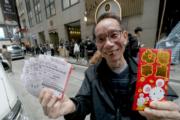 六合彩新年金多寶攪珠今晚(2日)舉行,假如10元一注獨中,估計頭獎高達1億元。有市民中午時分到位於中環士丹利街的投注站購買六合彩彩票,人龍由投注站延伸至街上。有保安在場維持秩序。