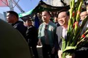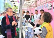 蛇年將至。特首李家超今日(28日)到訪屯門天后廟廣場年宵市場,民政及青年事務局長麥美娟、環境及生態局長謝展寰亦有隨行。李家超邊走邊消費,購買10枝劍蘭(共付約200元)、98元的風車,又以50元購買印有大熊貓圖案的揮春。李家超說,各攤檔受歡迎程度不同,相信花市人流隨著入夜會更旺。