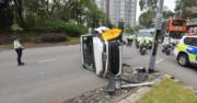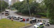 下午2時許,一輛九巴與七人車駛經在青衣鄉事會路迴旋處時發生相撞,其中七人車撞向燈柱後向右翻側,52歲姓梁七人車男司機一度被困,由消防救出,他頸部疼痛,清醒被送往瑪嘉烈醫院治理。九巴右邊車頭刮花,由職員駛走,24歲姓陳男車長在場協助警方調查。