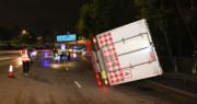 今日(10日)凌晨4時許,一輛食品公司密斗貨車沿漆咸道南往紅磡方向行駛,駛至理工大學對開左彎位,疑因天雨路滑失控打「白鴿轉」,衝上行人路,撞毁路旁10多米長防撞欄後翻側,車身擱在欄杆上,司機一度被困車內,救援人員到場救出男司機,他受輕傷清醒送院。現場所見,貨車向右翻側,貨斗壓向防撞欄,車頭嚴重損毁,零件碎片散落路面。