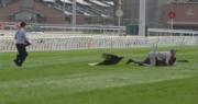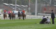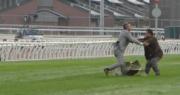 沙田馬場今日(14日)舉行一年一度的「浪琴香港國際賽事」,在下午4時45分的第8場「浪琴香港盃」賽事中,一名手持寫有「宏福苑」、「委員會」及「落台」等字句橫額的男子,在近終點線闖入賽道,及後被一名身穿灰身西裝的人士撲倒制服,其他在場職員亦加入制止該名人士並檢走橫額,過程中賽事未受影響,馬匹如常衝線。