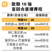 歐聯另一仗是飛燕諾主場迎戰國際米蘭,亦是日前在荷甲「地標」領軍主場打和奈梅亨的主教練尹佩斯,首度在歐聯督師,但難處是傷停多達12人。國米也至少有5名「十字軍」,其中翼衛費達歷高迪馬高因觸傷大腿需避戰3周。另意甲「四哥」祖雲達斯昨在聯賽主場以2:0勝維羅納取五連捷,落後榜首的國米6分。