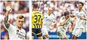 【明報專訊】「銀河艦隊」皇家馬德里及「蜜蜂兵團」多蒙特名宿,前日聚首皇馬主場班拿貝球場踢表演賽。上季高掛球靴的皇馬名宿中場卻奧斯(左圖)相隔378日重遊英雄地,並在上半場射入12碼扳平比數,皇馬傳奇隊另有巴迪斯達和昔日金童魯爾(右圖右二)建功,終與由施雲賓達、巴里奧斯和阿武羅素取得進帳的多蒙特傳奇隊以3:3握手言和。